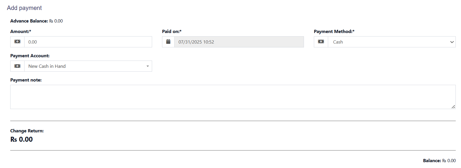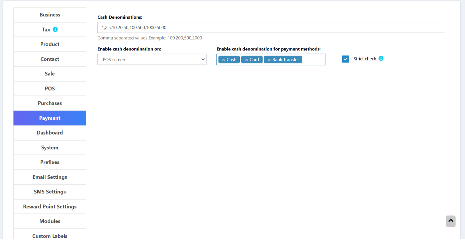 Cash denominations can be added while making a sale or purchase. To enable this Go to Settings -> Payment.