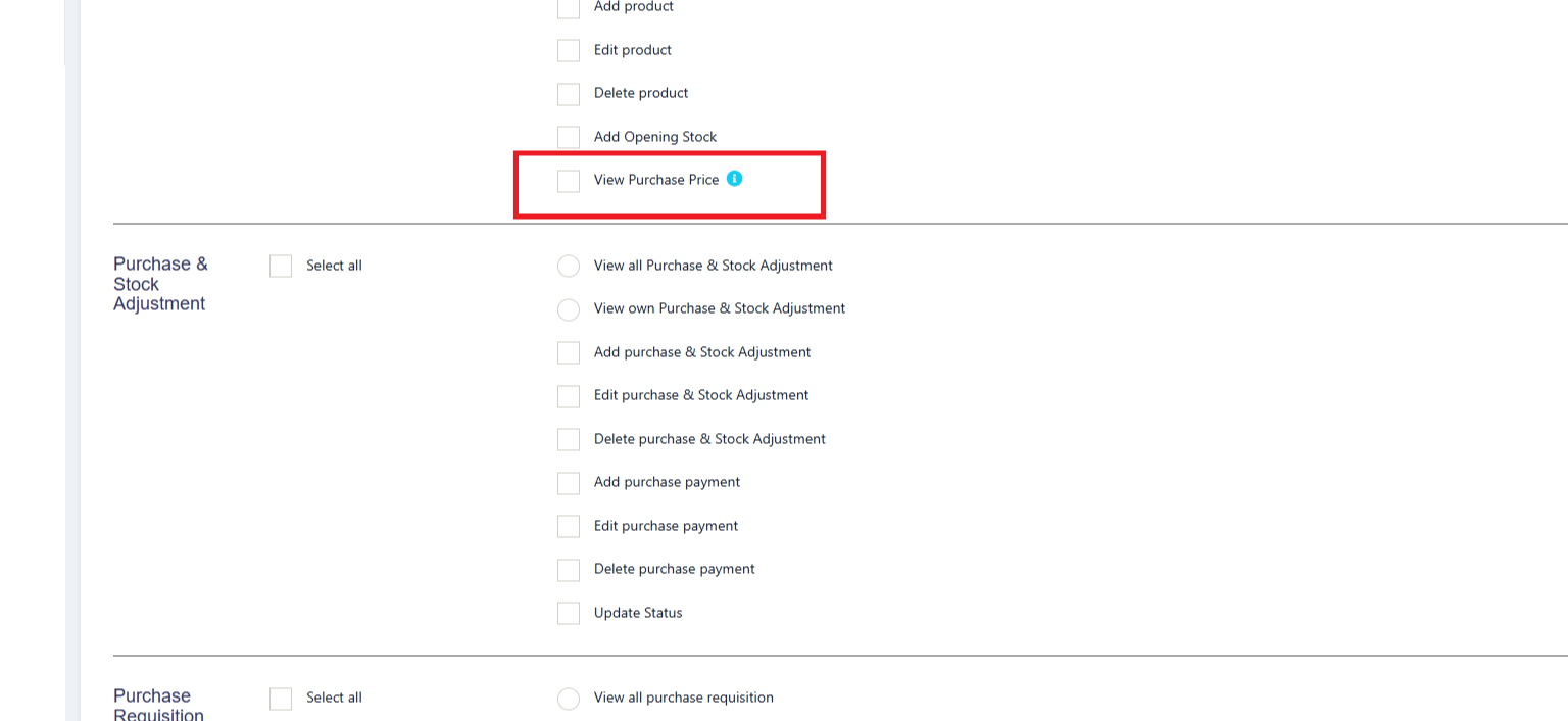 Step 3: Under the Product Section, you can disable the ‘View Purchase Price’ checkbox. If this is disabled, the user with the particular role can’t see the price while