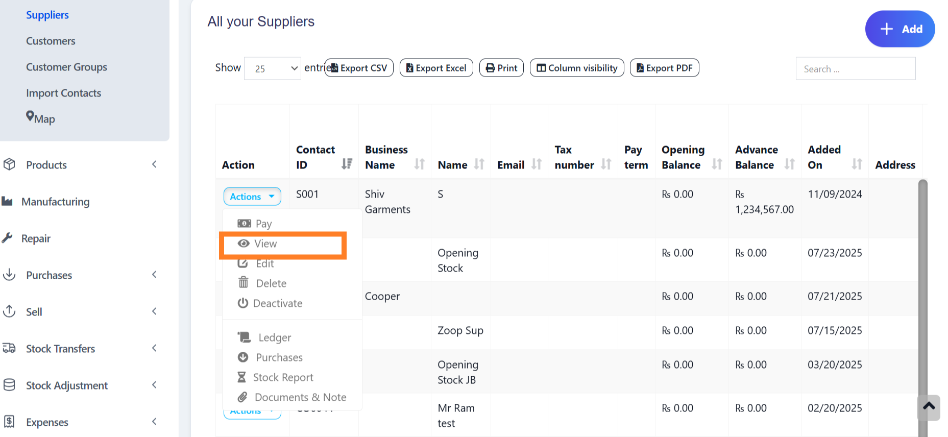 To view the opening balance of contact, go to List Supplier/customer, go to view, and on the view page, you will find the opening balance & opening balance due.