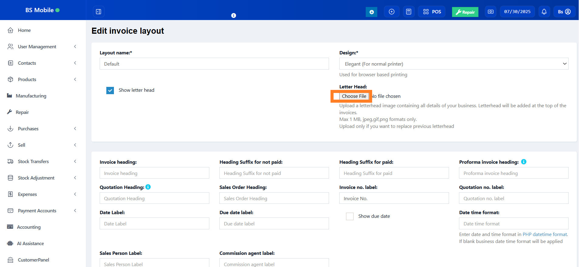 A letterhead image containing all details of your business(organization name, address, business registration & other details) can be added to invoices.