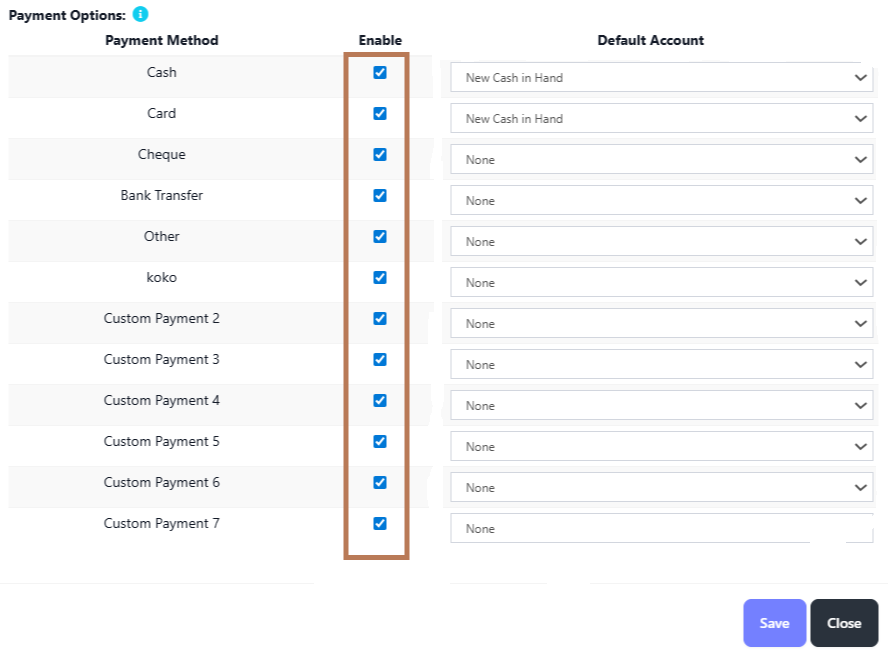 - In Add/Edit business location you will find a list of all payment methods, you can enable/disable it by checking/unchecking the option.