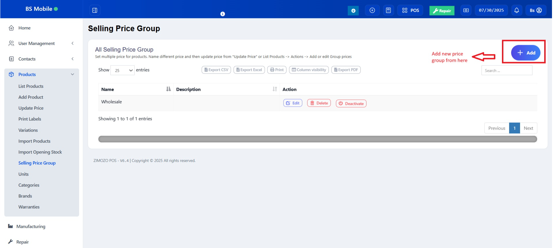 Click on “Add” button to add a new price group. For example Retail price or WholeSale price or Bulk Purchase price or Location 1 price etc as per your wish.