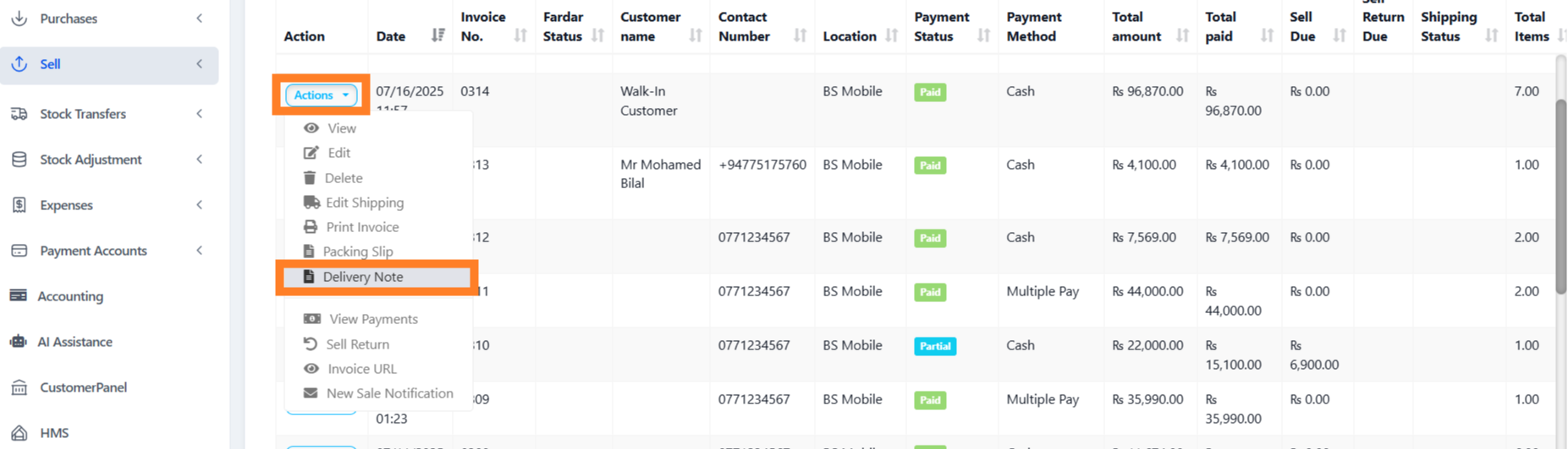 Step 3: From the Action dropdown menu, select the ‘Delivery Note‘ option, and proceed to print the delivery note directly.