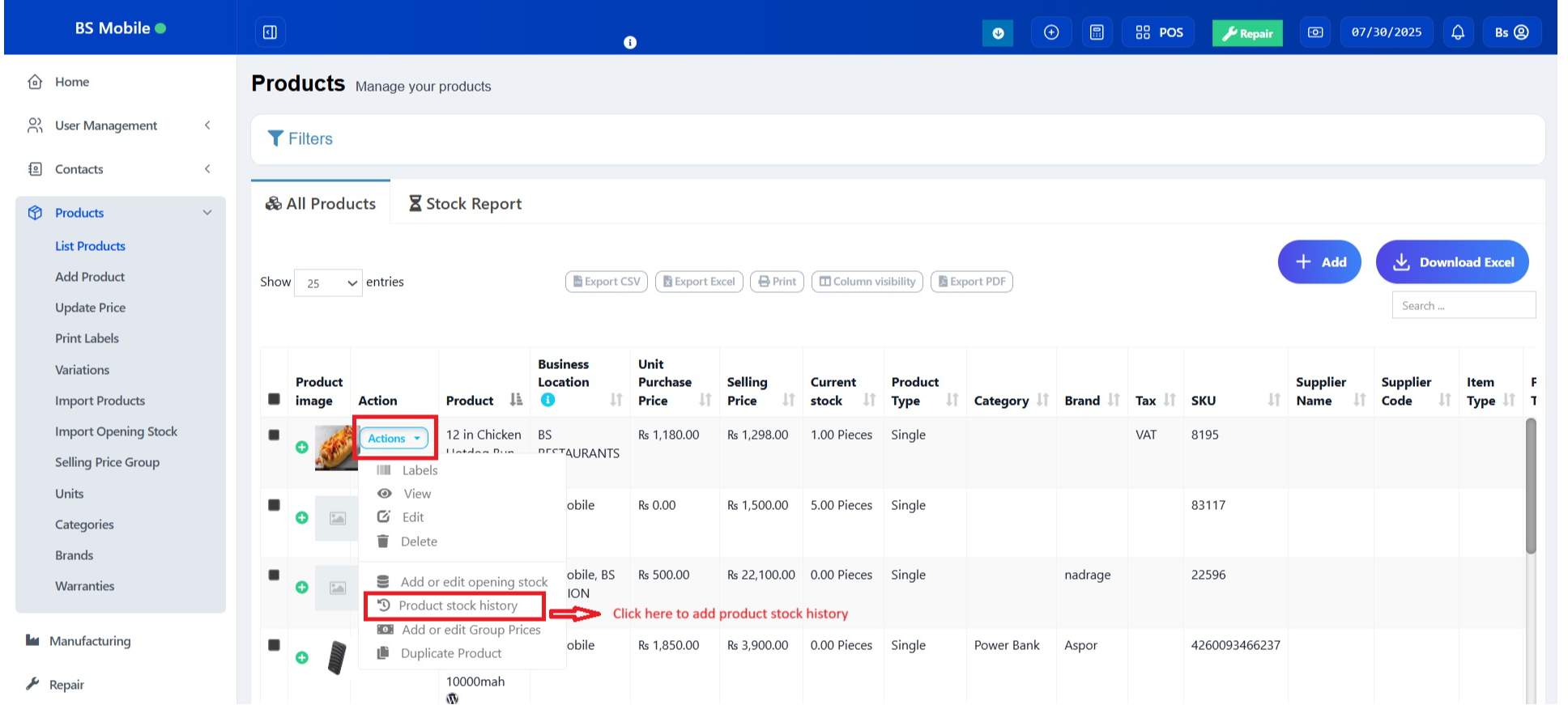 The Product Stock History feature allows you to view detailed records of all stock-related transactions for a specific product, including: