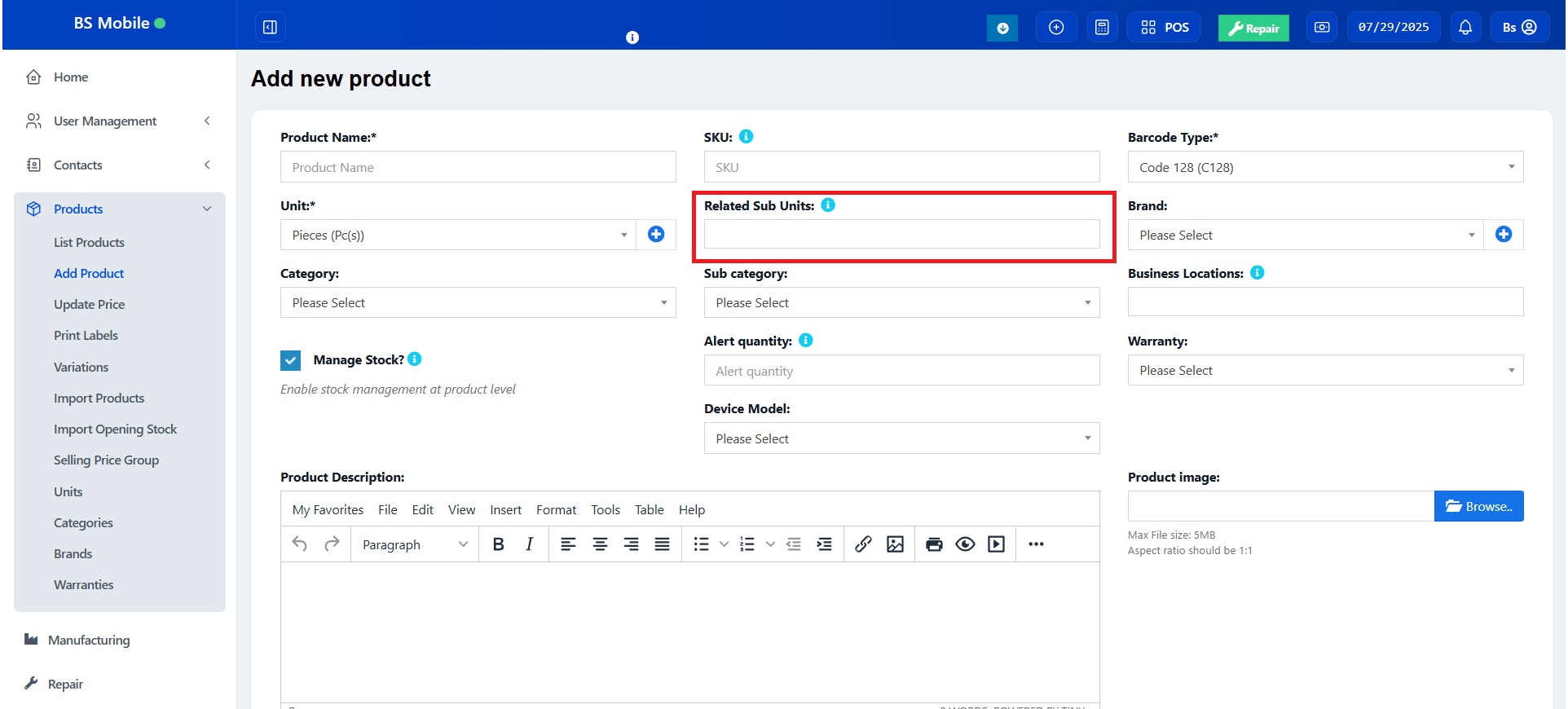 Now when adding products select the Unit for the products and it will give option to select multiple applicable sub-units. Selecting the sub-units will allow you to do purchases or sales on this selected sub-units.