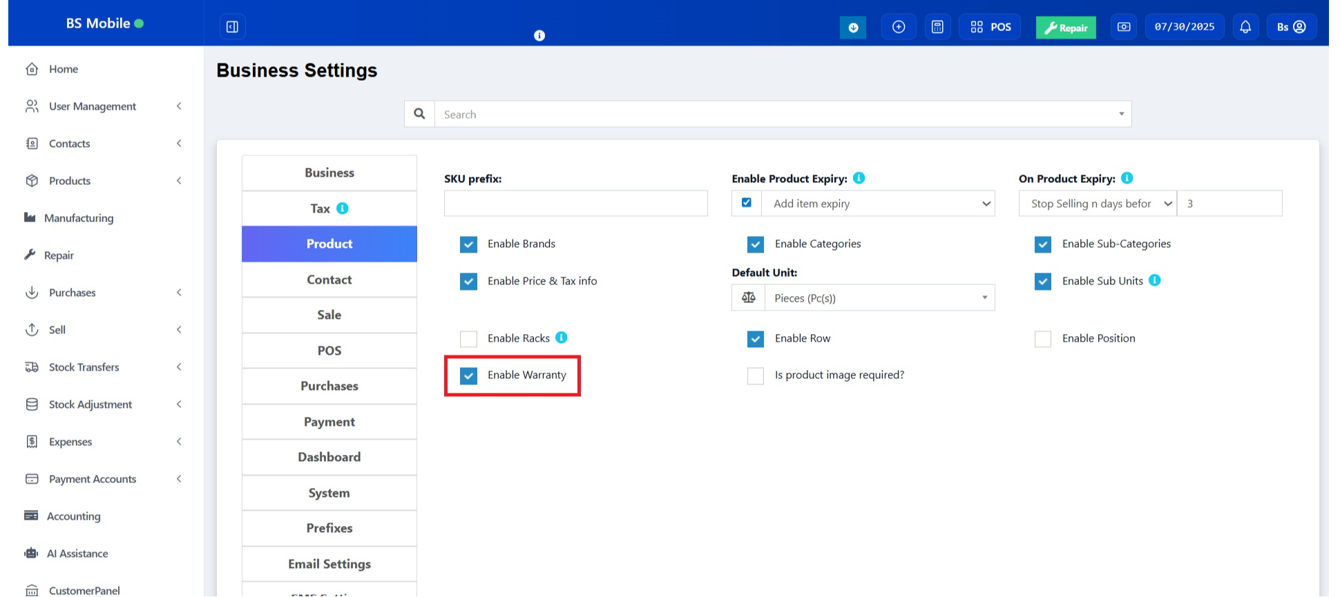 To enable warrany in products go to Settings -> Business Settings -> Products -> Enable Warranty