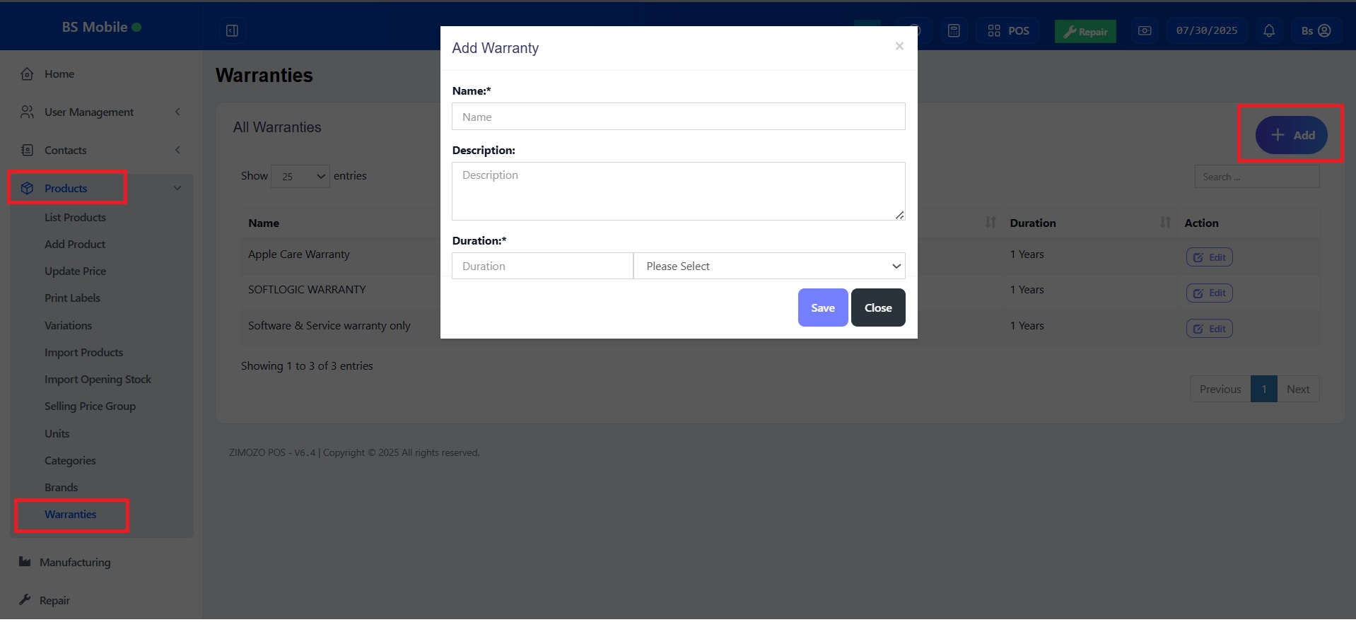 - Adding Warranty: Add warranty types by going to Products -> Warranty.