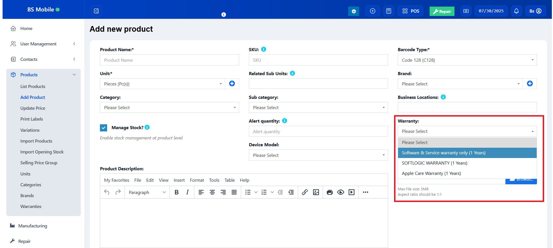 - Assigining warranty for products: Go to Add/Edit product and select the warranty that is applicable for the product.