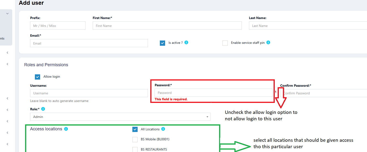 While adding the user, select the locations that the user can access. You can either select all locations or select one or more particular locations.
